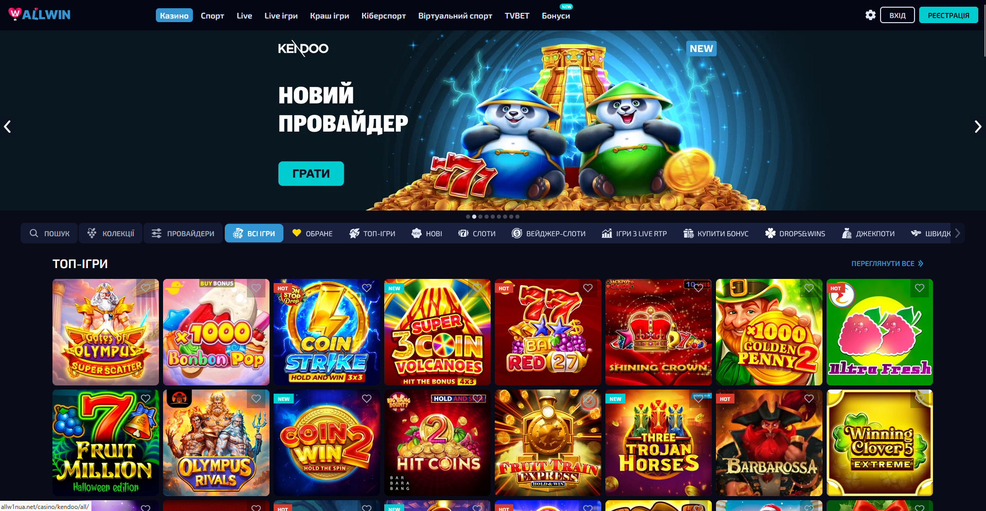 Каталог казино Аллвін містить понад 2500 ігрових автоматів від провайдерів Pragmatic Play (300+ слотів), NetEnt (180+), Microgaming (250+), Play'n GO (200+) та інших. Слоти розподілені на категорії: класичні «фрукти», відеослоти, Megaways, Cluster Pays, Hold and Win та Bonus Buy. Демо-режим доступний для більшості ігор - грай без грошей для вивчення механіки.